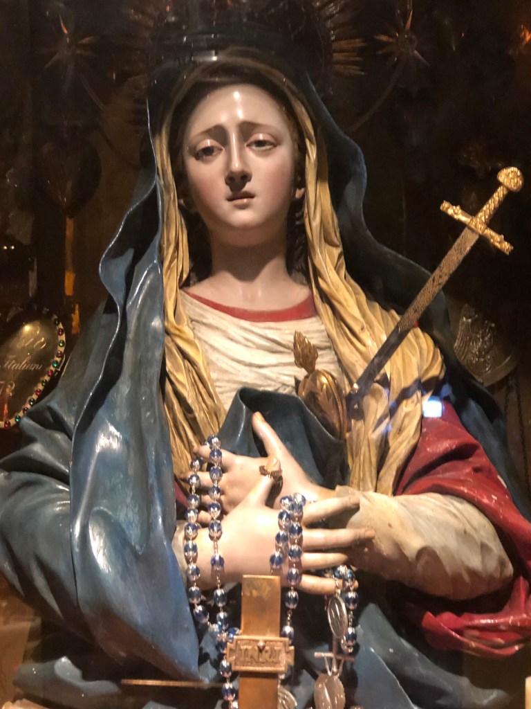 Our Lady of Sorrows This Image is inside the Church of the Holy Sepulcher, Jerusalem, (Catholic, Latin area of the church, near Calvary – Golgotha). The sword and rosary emphasize her sorrow, prayer, and silent participation in the Passion. It is Mary honored in the very heart of the Passion itself, inside Christianity’s holiest site. Photograph by Mariella Zevallos.
